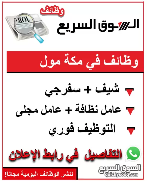 وظائف في مكة مول . مطلوب شيف + سفرجي + عامل مجلى + عامل نظافة