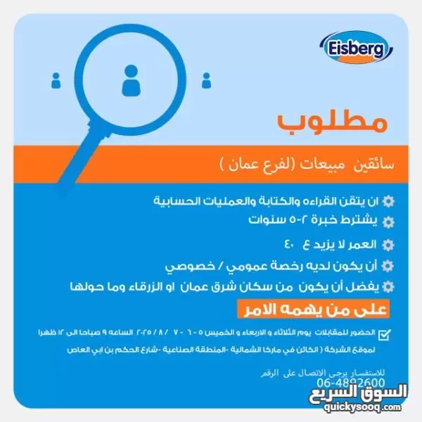 يُعلن مصنع عن حاجته لتعيين سائقين مبيعات للعمل في فرع عمان، حسب المواصفات التالية: