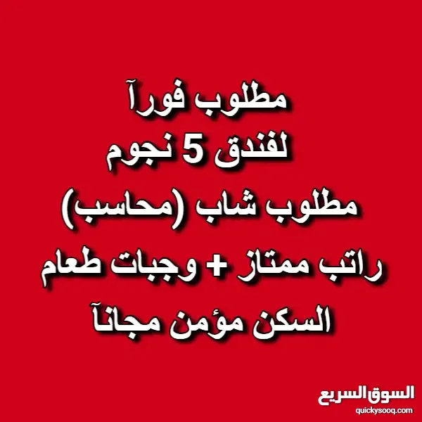 مطلوب محاسب في فندق 5 نجوم . راتب ممتاز + وجبات طعام + السكن مؤمن