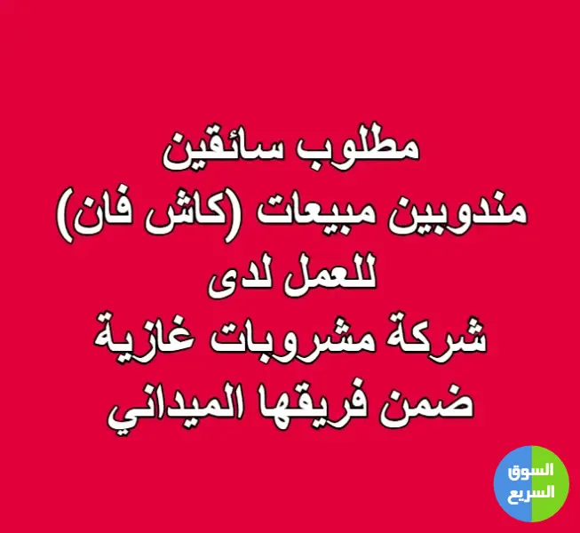 مطلوب سائقين مندوبين مبيعات (كاش فان) للعمل لدى شركة مشروبات غازية ضمن فريقها الميداني