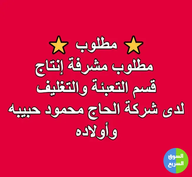 ⭐مطلوب مشرفة إنتاج⭐ قسم التعبئة والتغليف للعمل لدى شركة الحاج محمود حبيبه وأولاده