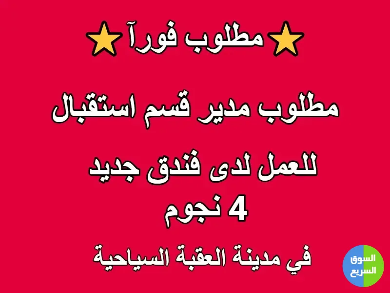 فندق أربع نجوم جديد في العقبة يبحث عن مدير استقبال بخبرة عملية في إدارة فرق العمل داخل قسم الاستقبال.