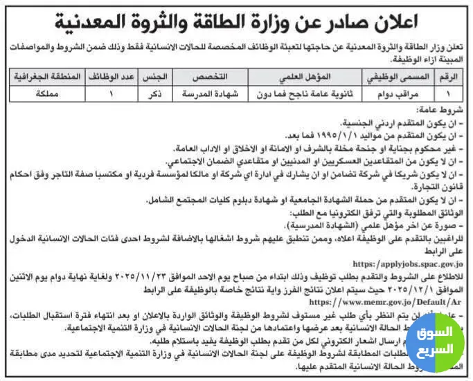 مطلوب مراقب دوام - وظيفة حكومية - وزارة الطاقة - لمن هم ثانوية عامة فما دون