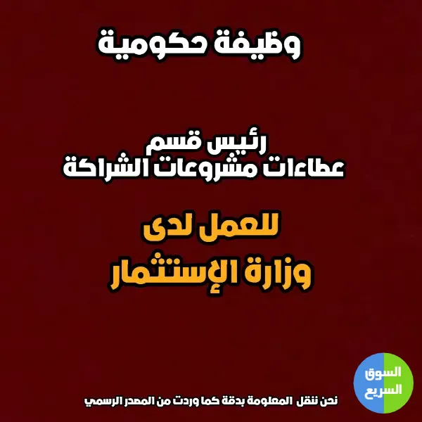 تعلن وزارة الاستثمار عن توفر شاغر لرئيس قسم عطاءات مشروعات الشراكة، للعمل ضمن بيئة متخصصة في إدارة مشاريع الشراكة بين القطاعين العام والخاص.