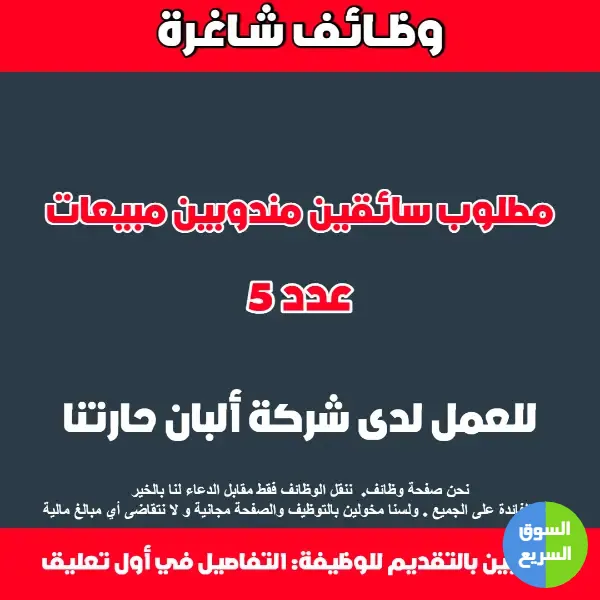 مطلوب سائقين مندوبين مبيعات لشركة ألبان كبرى