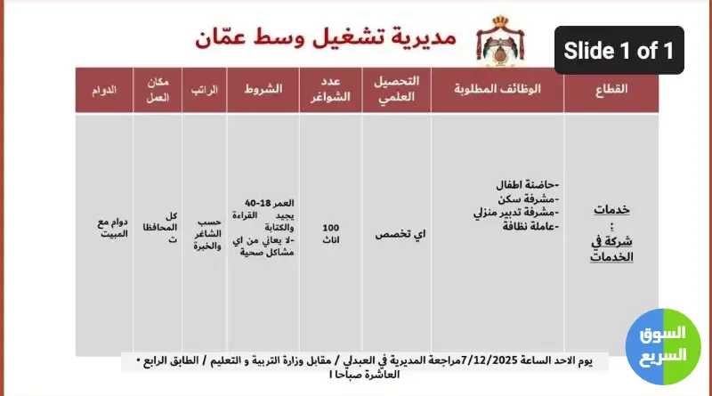 🔵 تعلن مديرية تشغيل وسط عمان عن توفر 100 شاغر وظيفي للإناث (بنات)
