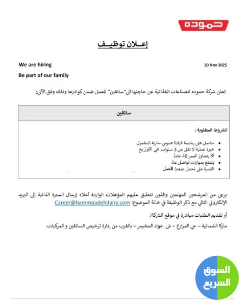 🔵 تعلن شركة حموده للصناعات الغذائية عن حاجتها لتوظيف سائقين