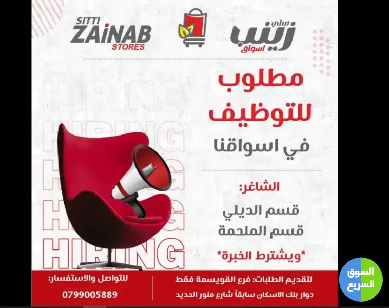مطلوب موظفين للعمل لدى أسواق تجارية (أسواق ستي زينب في عمان).