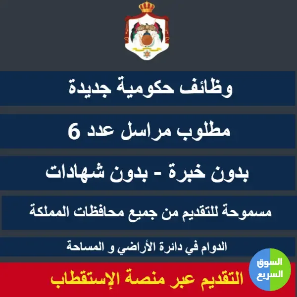 أعلنت الحومة الاردنية عبر منصة الاستقطاب عن حاجة دائرة الاراضي و المساحة لتوظيف عدد من الموظفين في : وظيفة مراسل