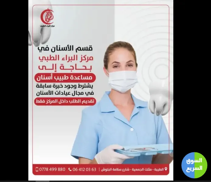 1️⃣ أعلن مركز البراء الطبي عن حاجته لتوظيف : مساعدة طبيب أسنان