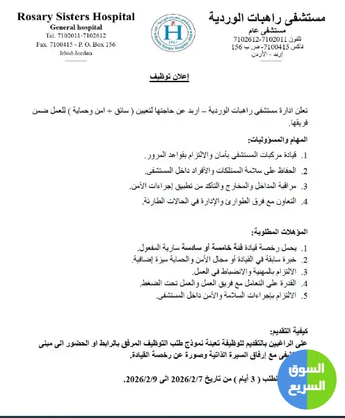 مطلوب سائق و موظف امن وحماية للعمل في مستشفى الراهبات الوردية