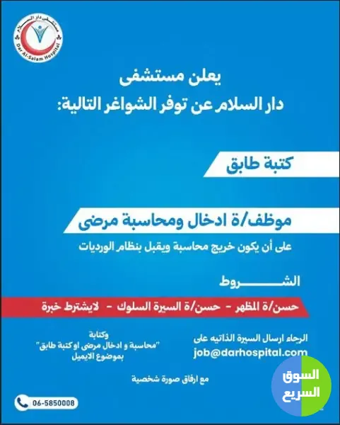 1️⃣ أعلن مستشفى دار السلام عن توفر شاغرين وظيفيين.