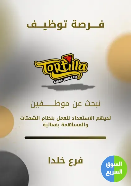 1️⃣ أعلنت مجموعة مطاعم تورتيلا عن حاجتها لتعيين موظفين للعمل في الفرع الجديد بمنطقة خلدا – إشارات البشيتي.