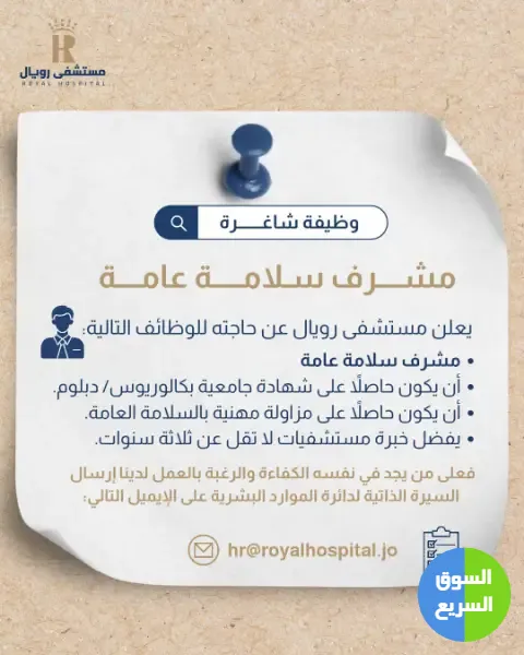 1️⃣ أعلن مستشفى رويال (ROYAL HOSPITAL) عن حاجته لتعيين مشرف سلامة عامة.