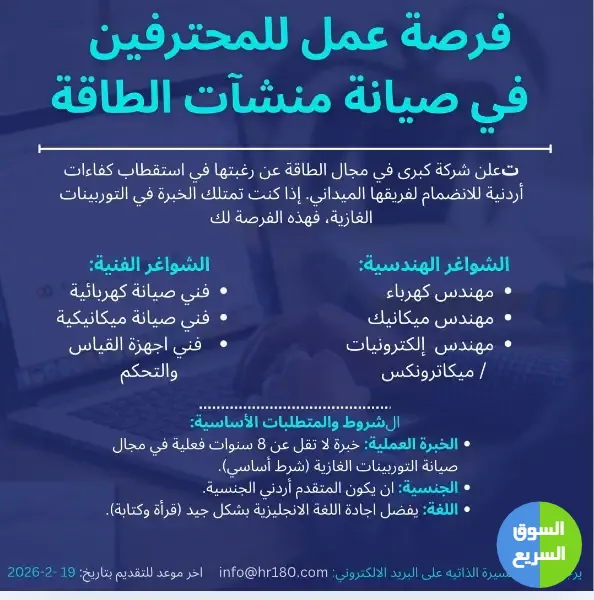 1️⃣ أعلنت شركة كبرى في مجال الطاقة عن رغبتها في استقطاب كفاءات أردنية للانضمام لفريقها الميداني في مجال صيانة التوربينات الغازية.