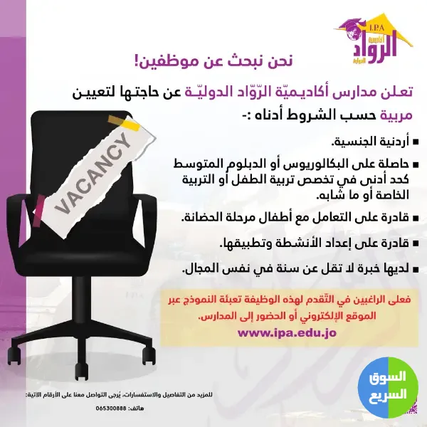 1️⃣ أعلنت مدارس الرواد الدولية عن حاجتها لتوظيف مربيات أطفال.