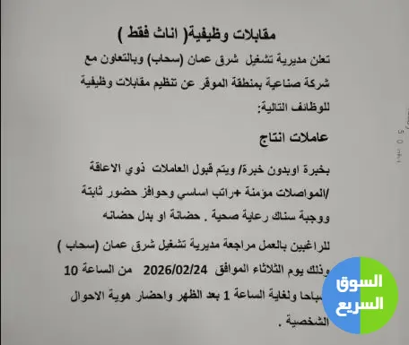 1️⃣ أعلنت مديرية تشغيل شرق عمان (سحاب) عن تنظيم مقابلات وظيفية (إناث فقط) بالتعاون مع شركة صناعية في منطقة الموقر.