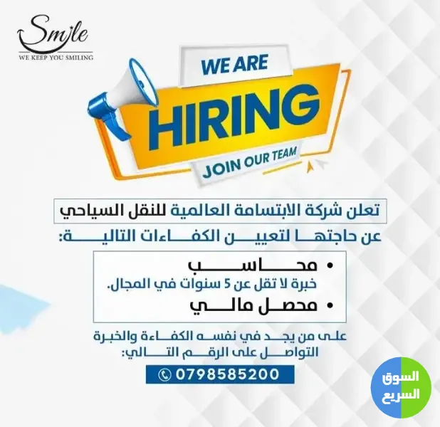 1️⃣ أعلنت شركة الابتسامة العالمية للنقل السياحي عن حاجتها لتعيين الكفاءات التالية.