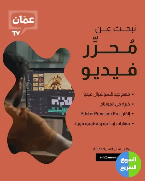 1️⃣ أعلنت قناة عمان TV (Amman TV) عن فتح باب التوظيف الفوري لشغل شاغر محرر فيديو (Video Editor) للعمل ضمن فريقها الإبداعي.