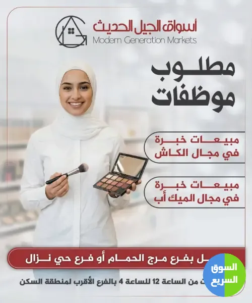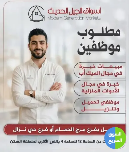 1️⃣ أعلنت أسواق الجيل الحديث (Modern Generation Markets) عن حاجتها لتعيين موظفين وموظفات للعمل في فرعي مرج الحمام وحي نزال.