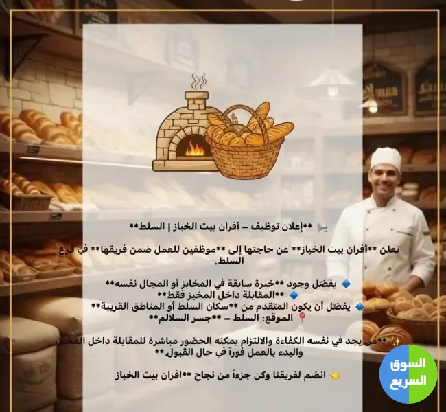 🔴 5️⃣ شرط إضافي: (يفضّل وجود خبرة سابقة في المخابز أو المجال نفسه)