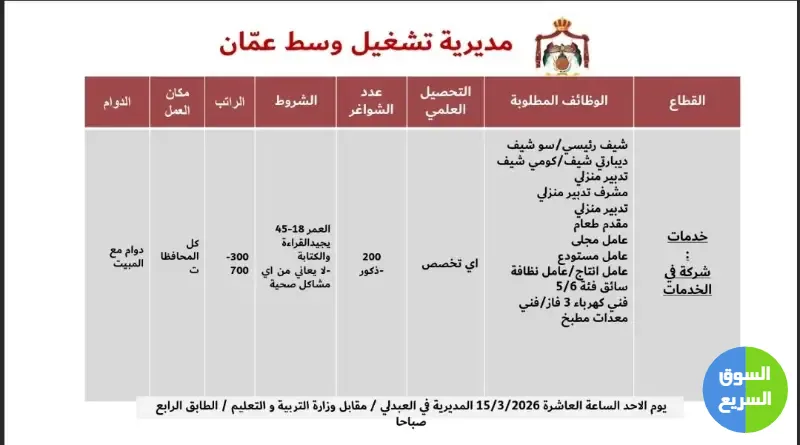 🟣 1️⃣8️⃣ وظائف مقدمي طعام في عمان 2026: فرصة للعمل عبر مديرية تشغيل وسط عمان