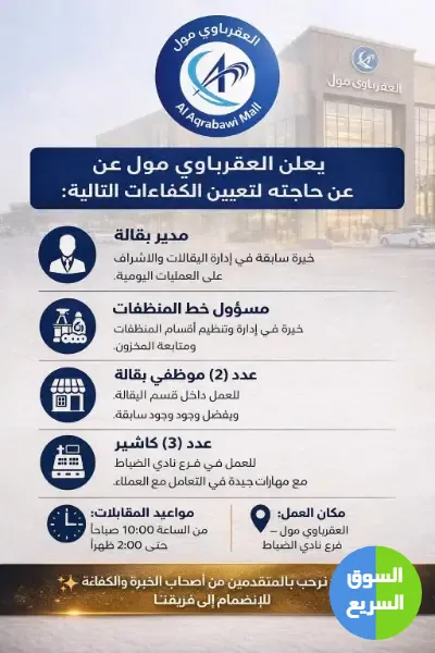 🟣 1️⃣6️⃣ وظائف في الأردن 2026: فرصة للعمل في العقرباوي مول (فرع نادي الضباط)