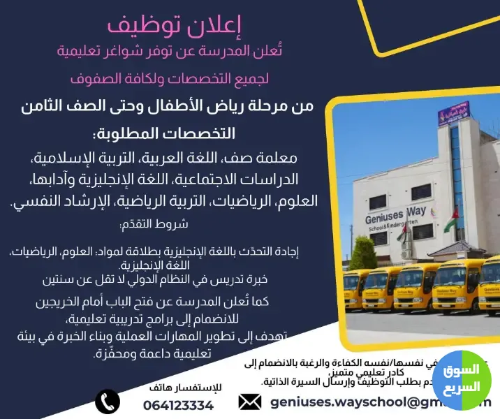 1️⃣ أعلنت مدرسة وروضة طريق العباقرة عن توفر شواغر تعليمية لجميع التخصصات والصفوف من مرحلة رياض الأطفال وحتى الصف الثامن.