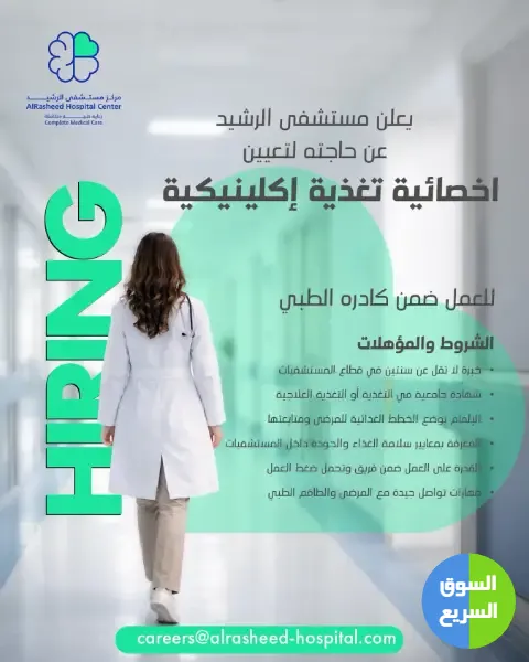 1️⃣ أعلن مستشفى الرشيد عن حاجته لتعيين أخصائية تغذية إكلينيكية للعمل ضمن كادره الطبي.
