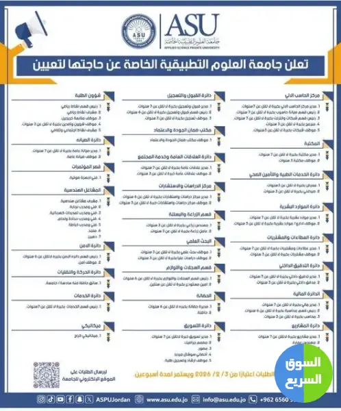 1️⃣ أعلنت جامعة العلوم التطبيقية الخاصة عن حاجتها للتعيين في دائرة الأمن.
