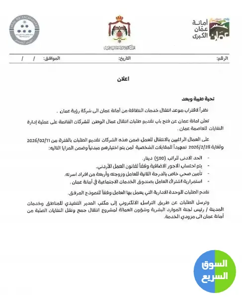 مراقبين كاميرات دوام مسائي ليلي و التقديم اليوم الساعة 10 صباحآ في مديرية تشغيل وسط عمان