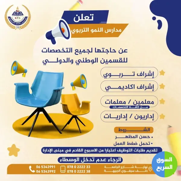 1️⃣ أعلنت مدارس النمو التربوي عن حاجتها لتعيين كوادر لجميع التخصصات للقسمين الوطني والدولي.