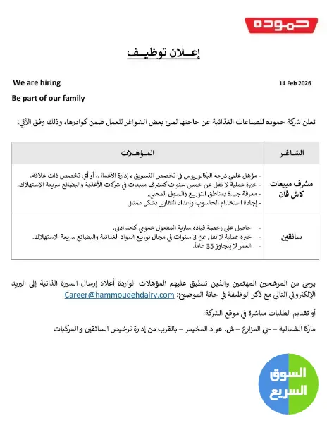 1️⃣2️⃣ البريد الإلكتروني للتقديم: (Career@hammoudehdairy.com).