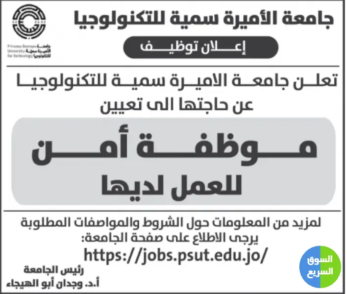 مطلوب موظفة امن للعمل في جامعة الاميرة سمية