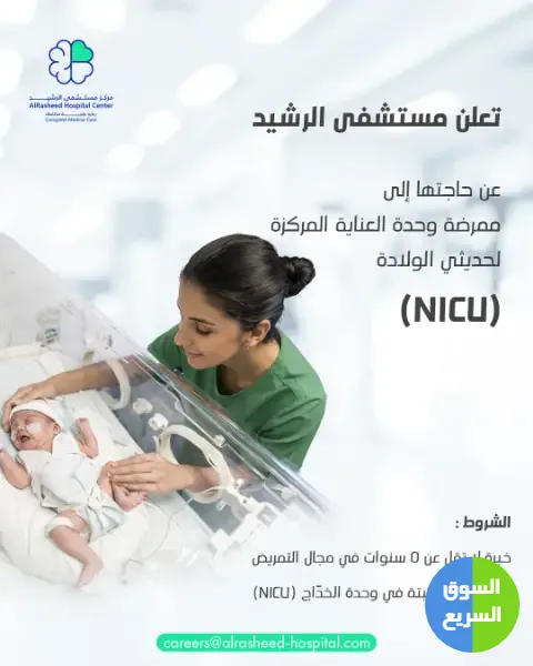1️⃣ أعلنت مستشفى الرشيد عن حاجتها إلى ممرضة وحدة العناية المركزة لحديثي الولادة (NICU).