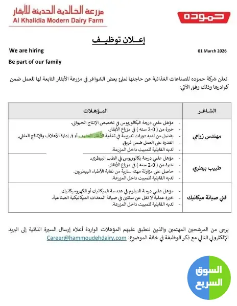 1️⃣ أعلنت شركة حموده للصناعات الغذائية (مزرعة الخالدية الحديثة للأبقار) عن حاجتها لملء بعض الشواغر للعمل ضمن كوادرها.