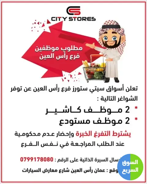 **طريقة التقديم المباشر:** يرجى التوجه إلى فرع سيتي ستورز في رأس العين، أو إرسال السيرة الذاتية عبر واتساب على الرقم (0799178080).