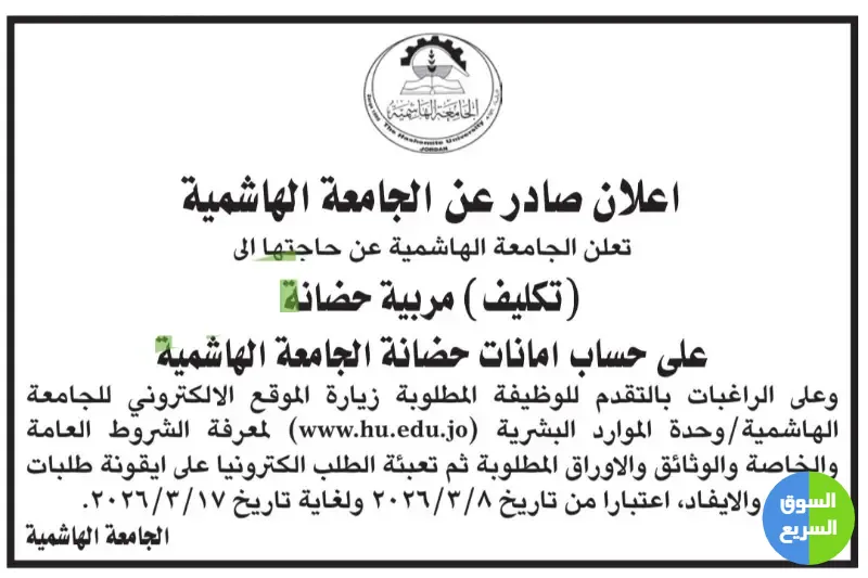 1️⃣ أعلنت الجامعة الهاشمية في الأردن عن حاجتها لتعيين مربية حضانة (تكليف) للعمل على حساب أمانات حضانة الجامعة.